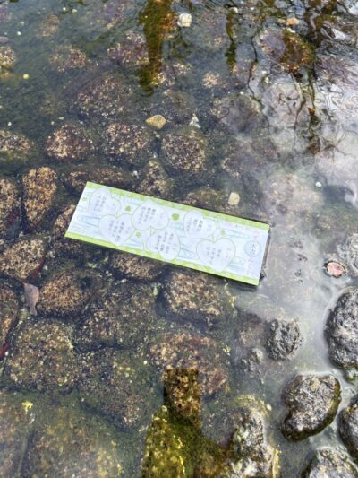 下鴨神社の水みくじは、売り場に積まれていてそこから紙を適当にとってレジに持っていくシステム